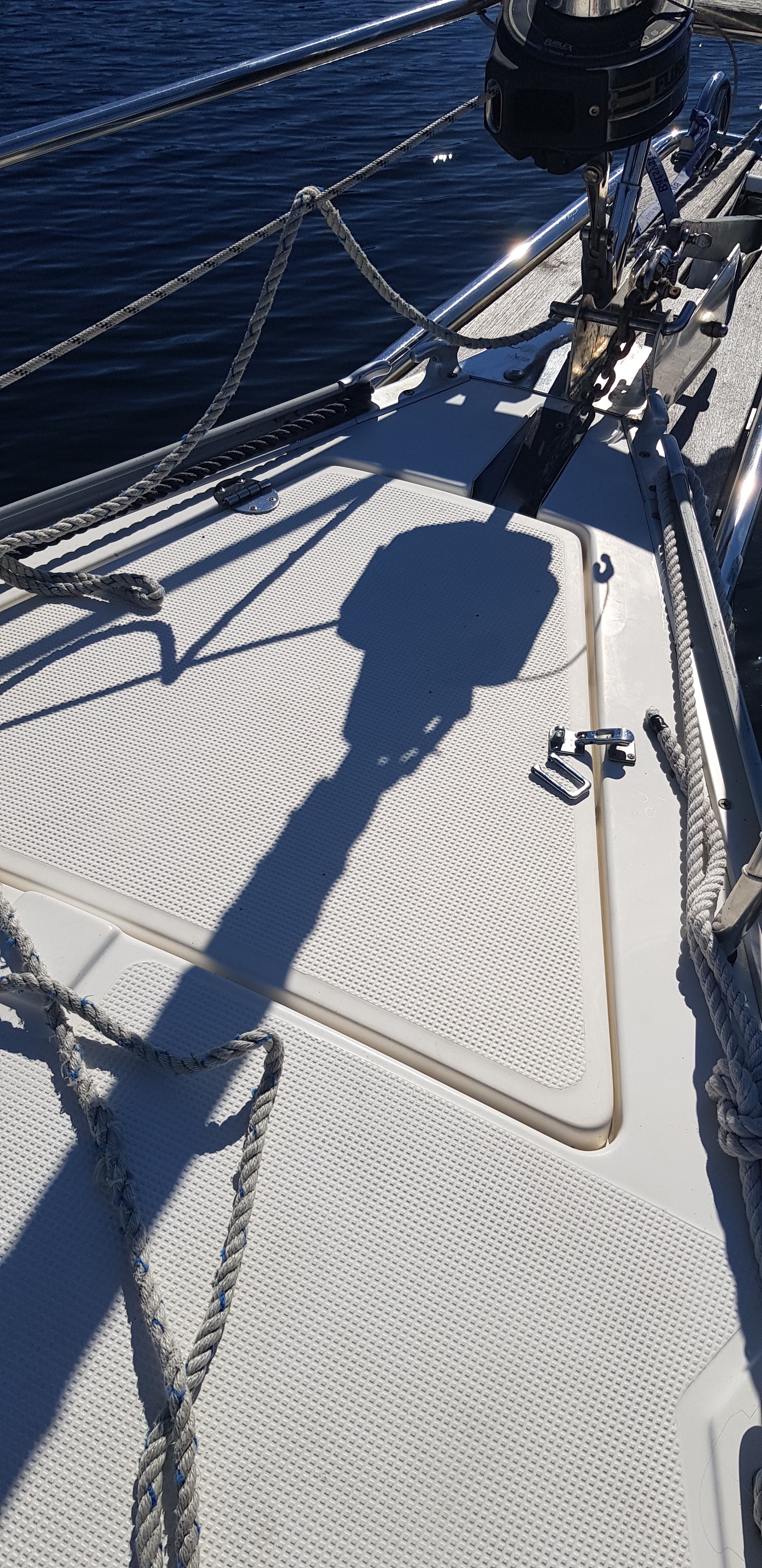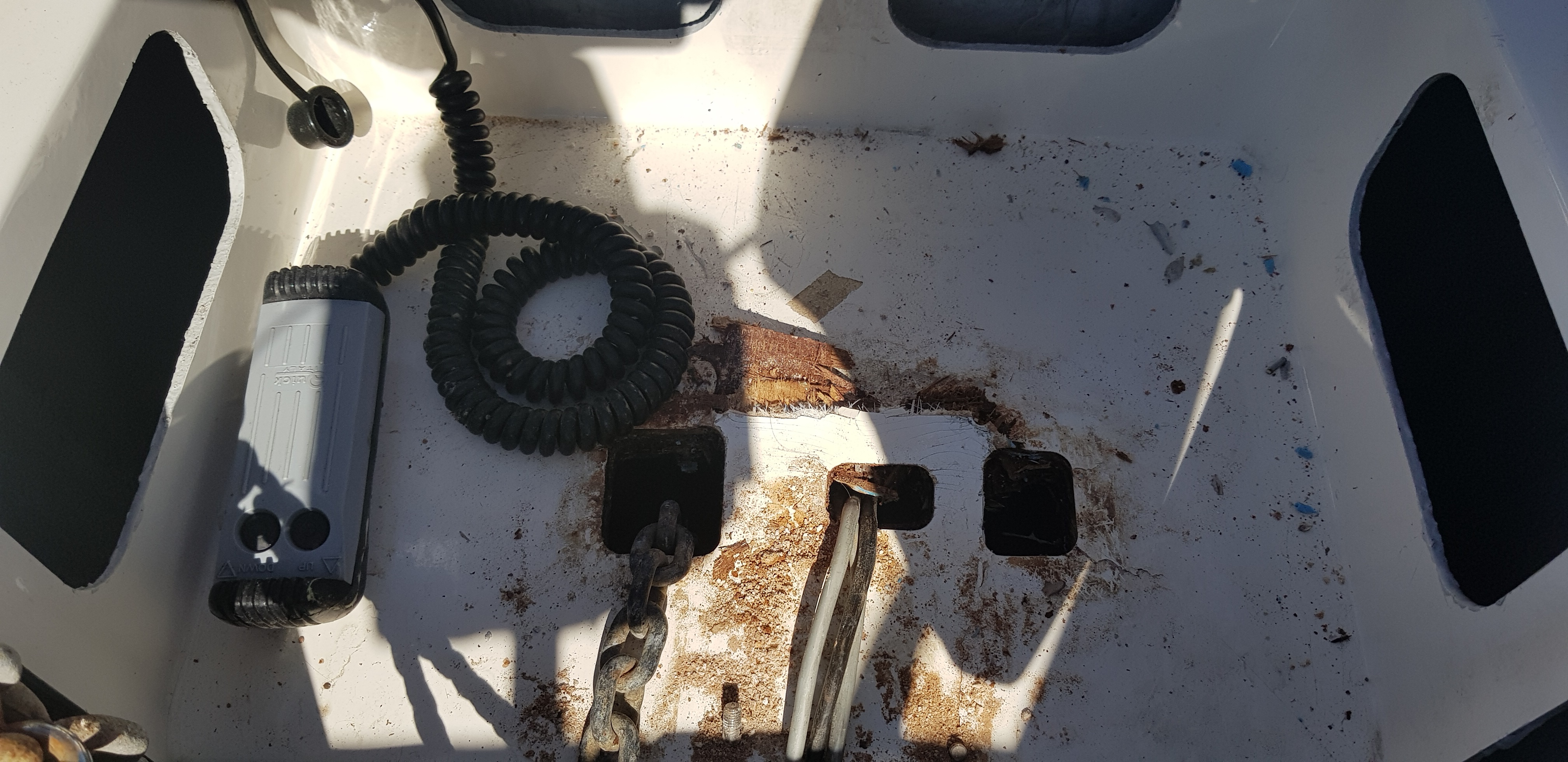 Lørdag morgen ønsket vi oss tidlig av gårde, og etter fylling av to store nye blåser (sånne fendere som ser ut som bøyer), gjorde vi oss klar til å kaste loss. Men når vi slo på sikringene før start kom det en voldsom lyd fra baugen! Før vi rakk å summe oss hadde en kortslutning i vinsjen til dreggen gjort at vinsjen startet. Siden den var festet med sikring rev vinsjen seg løs fra festene nede i brønnen og stoppet ikke å gå før den landet nede i bunnen av brønnen. Med voldsom kraft var nå festet og hengsel på luken revet av. Det så både kostbart og håpløst ut og vi holdt på å miste motet.