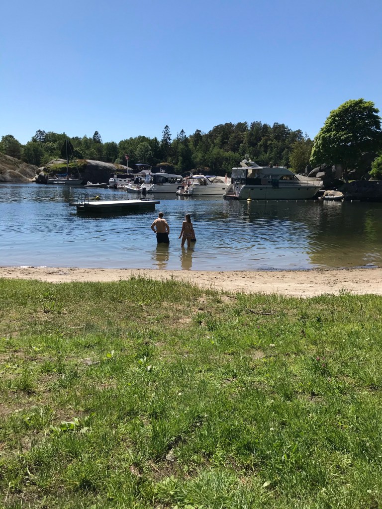 Her i Paradisbukta var det bare en liten rotur inn til sandstranden og vi kunne nyte et glass rødvin på dekk mens feststemte ungdommer kjørte musikk fra båten mens de passerte. Ungene inviterte til bading på sandstranden og vi kunne beundre to barn som var langt flinkere til å svømme enn vi kunne huske fra forrige sommer. Takk til skolen som driver svømmeopplæring!